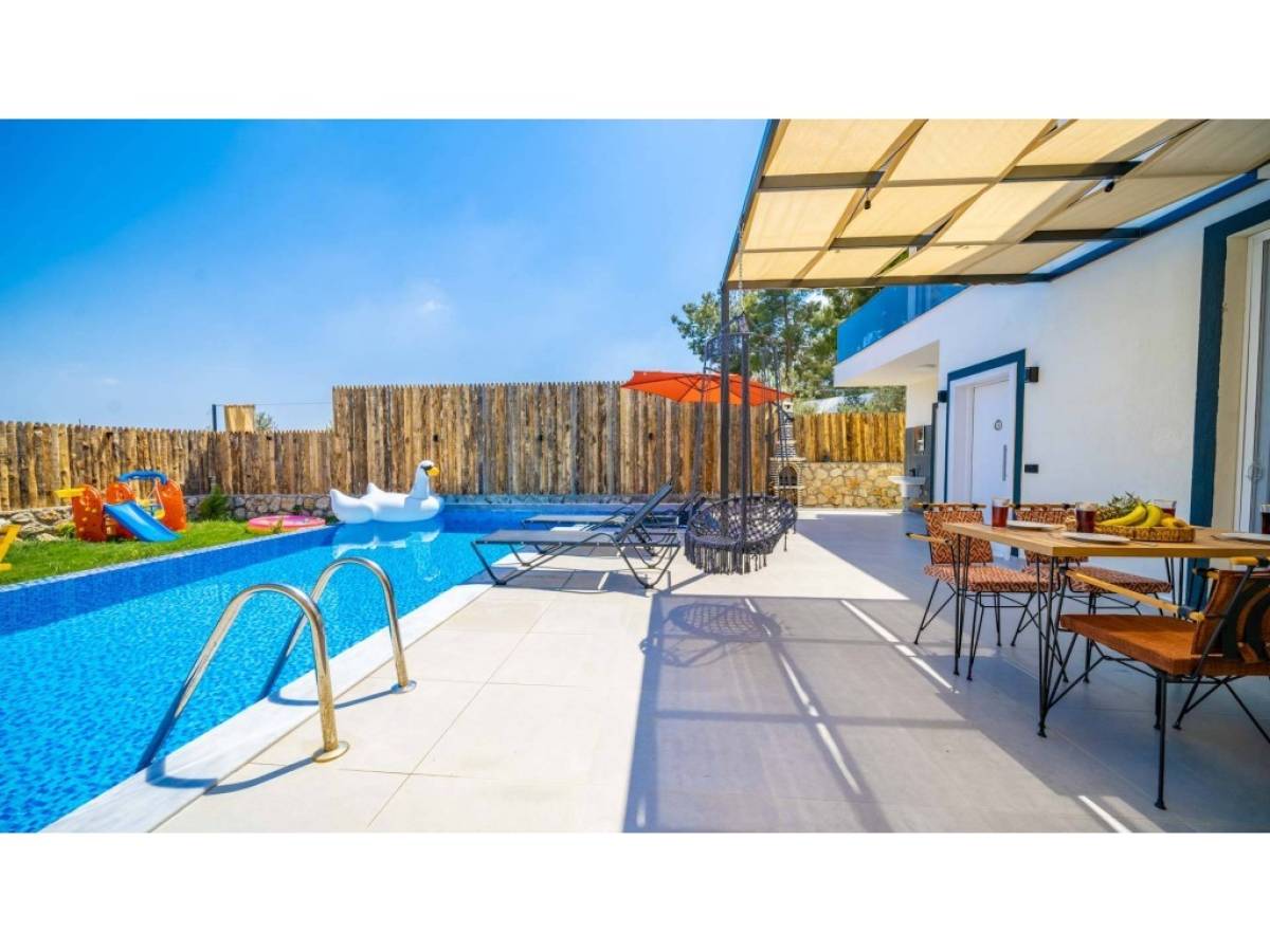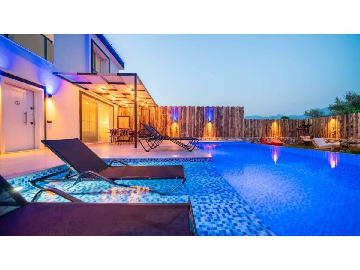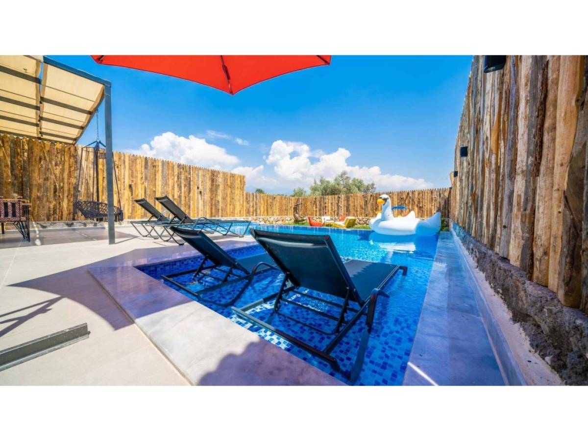 Evin dış alanında bulunan özel yüzme havuzu, günün her saatinde özgürce serinleme imkânı sunarken; güneşlenme alanları, şezlonglar ve oturma köşeleri manzaranın tadını çıkarmanız için idealdir. Akşam saatlerinde ise gün batımı eşliğinde sevdiklerinizle keyifli anlar yaşayabilir, Kalkan’ın huzurlu atmosferini doyasıya hissedebilirsiniz.